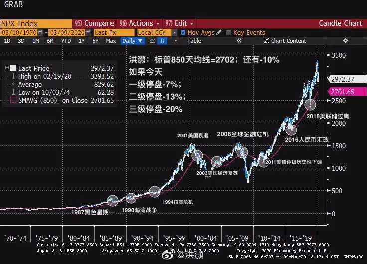 盤中,標(biāo)普500指數(shù)跌7%,觸發(fā)一級熔斷機(jī)制。另美國在1987年的“黑色星期一”的3個月之后推出了股指熔斷機(jī)制,分為7%,13%,20%的三檔下跌熔斷。三十多年來的美股市場,此前真正觸發(fā)熔斷僅有一次:1997年10月27日,道瓊斯工業(yè)指數(shù)暴跌7.18%,收于7161.15點(diǎn),創(chuàng)下自1915年以來最大跌幅。