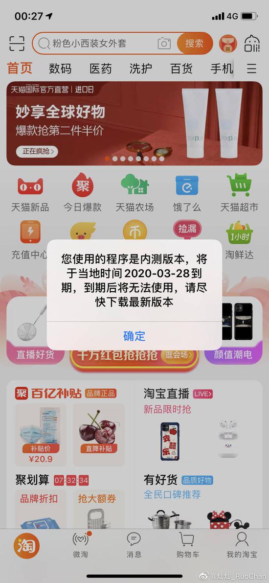 3月25日消息,今日,大量網(wǎng)友在社交平臺反映稱,手機淘寶iOS版9.5.7版本打開后會出現(xiàn)“您使用的程序是內(nèi)測版本,將于當?shù)貢r間2020-03-28到期,到期后將無法使用,請盡快下載最新版本”的彈窗。