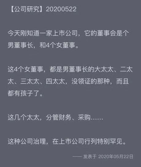 公告顯示,關注到相關媒體刊登轉載標題為“一男四女的上市公司董事會,私募大佬驚呼: 特別罕見!”等新聞。文中提到侯安揚于2020年5月22日在小紅圈投資社群發布了 一篇文章。此后部分媒體進行轉載,不斷臆測、杜撰 、編造吸引眼球的標題及內容,并關聯到公司。相關報道與事實嚴重不符,為避免誤導投資者,現予以澄清說明。