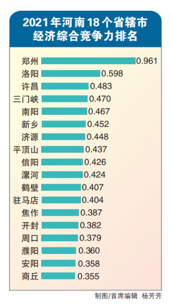在綜合競爭力評價中,鄭州市、洛陽市、許昌市占據前三位。排名第4到第10位的分別是三門峽市、南陽市、新鄉市、濟源市、平頂山市、信陽市、漯河市。《評價》指出,與2020年河南省轄市經濟綜合競爭力總評價排名相比,2021年排名總體變化不大,但是個別省轄市的排名變化比較明顯。鄭州市、洛陽市作為中心、副中心城市的地位和作用突出,鄭州市、洛陽市不僅占據了省轄市經濟綜合競爭力排名的前兩位,而且,排名相對靠前的許昌市、三門峽市(部分處于洛陽都市圈范圍)、新鄉市、濟源市、平頂山市也處在鄭州都市圈、洛陽都市圈范圍之內。