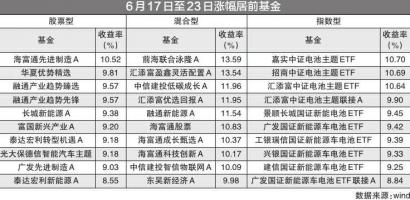 WIND數據顯示,6月17日至6月23日期間,507只普通股票型基金的平均收益率為2.87%。其中,有475只基金實現正向收益,占比超九成,周內收益率超5%的基金有82只。
