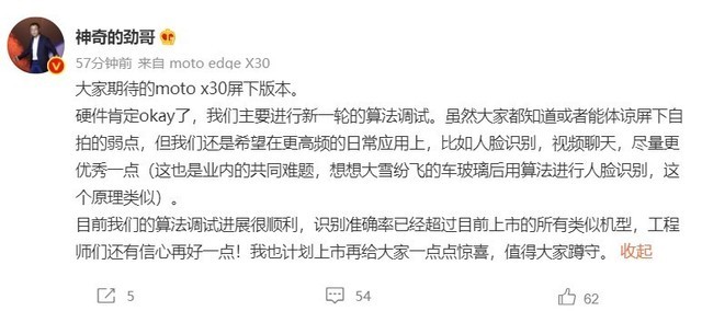 今日,聯想中國區手機業務部總經理陳勁發文曝光了屏下攝像頭版moto Edge X30版進展。