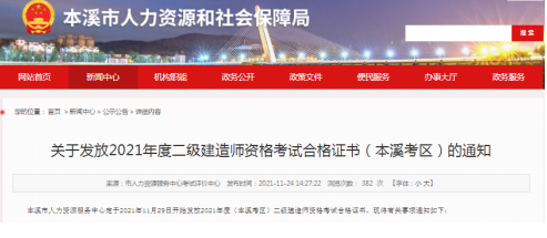 11月23日,遼寧盤錦市人事考試網發布了《關于2021年度二級建造師考試合格證書發放通知》,定于2021年11月25日開始發放2021年二級建造師考試合格證書。