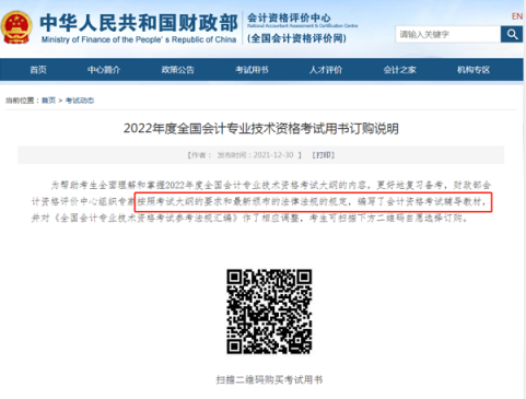 12月29日,財政部正式發布了《2022年初級會計考試新大綱》。次日,財政部會計資格評價中心發布《2022年度全國會計專業技術資格考試用書訂購說明》,通知中明確指出,新教材將根據考試大綱和最新法律法規進行調整和修訂,現在可以在官網上掃碼訂購。