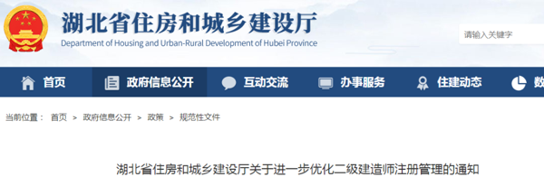 2022年1月25日,湖北省住建廳發(fā)布了《關(guān)于進(jìn)一步優(yōu)化二級建造師注冊管理的通知》,其中明確提出:取消二級建造師注冊市州審核環(huán)節(jié)。