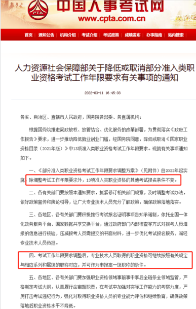3月11日,中國人事考試網發布《關于降低或取消部分準入類職業資格考試工作年限要求有關事項的通知》,其中明確提出降低一級建造師、監理工程師、安全工程師等13項職業資格考試報考的工作年限。