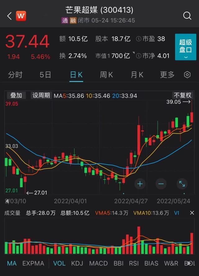 今天盤中,芒果超媒漲幅一度擴大至10%,報39.05元,成交額達5億。截至收盤,報37.44元,漲幅5.46%。