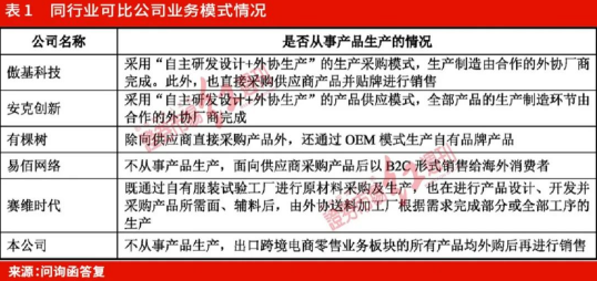 三態股份在招股書中將傲基科技、安克創新、有棵樹、易佰網絡、賽維時代作為同行業可比公司,其中除了易佰網絡不從事生產外,其余公司均包含自主生產或“自主研發設計+外協生產”。并且,目前同在創業板申請上市的跨境電商致歐科技也是采取“自主研發及外協生產”模式,對比來看,三態股份的業務模式與同行業內大部分企業均有所不同。