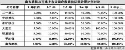 南方路機在招股書中指出,公司2年以內的應收賬款壞賬準備計提比例略低于同行業上市公司平均水平,2年以上的壞賬準備計提比例與同行業上市公司平均水平相當。對此表述,有業內人士認為,公司1年以內、1-2年應收賬款明顯低于同行平均水平,公司表述存在一定誤導。