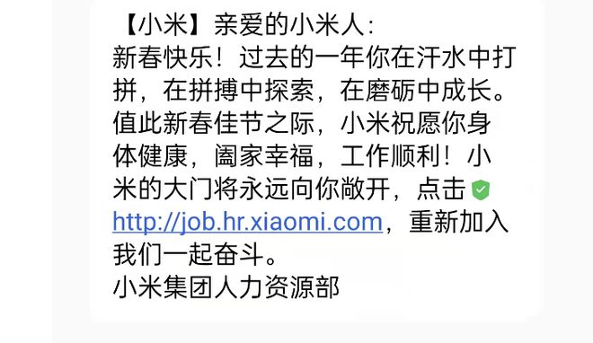 不僅如此,此前小米的離職老員工近日還收到短信消息稱小米的大門永遠敞開,歡迎重新加入小米一起奮斗。