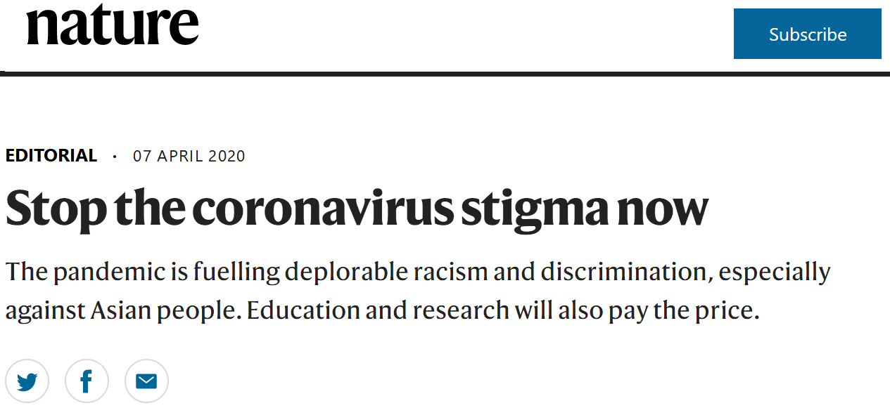 《自然》雜志微信公眾號“Nature自然科研”4月9日發表社論《停止新冠病毒的污名化》: