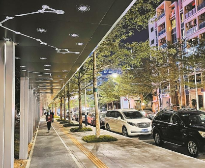 “水幔”從頂部緩緩垂落并延伸至地面綠化處,在靠近地面處都配有燈光,亮燈后,能投屏呈現出特定圖案,美輪美奐。