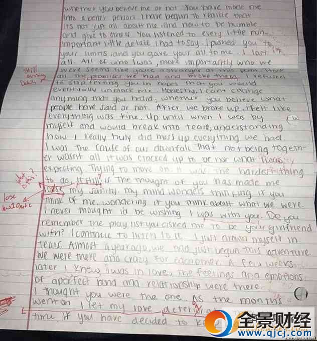 批改前女友道歉信:又是圈錯字、寫評語,又是打分