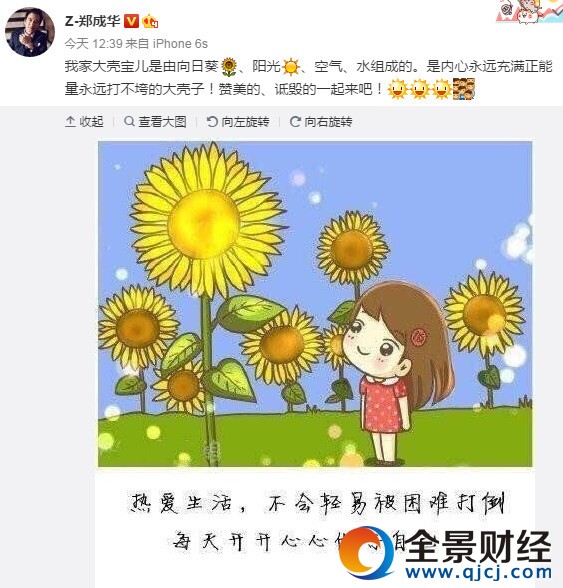 3月2日,鄭爽爸爸曬出兩張正能量的漫畫,聲援女兒。畫面中,一個小姑娘面對著向日葵微笑,配文中則是“熱愛生活,不會輕易被困難打倒”之類的正能量。鄭成華發(fā)文稱:“我家大殼寶兒是由向日葵、陽光、空氣、水組成的。是內(nèi)心永遠充滿正能量永遠打不垮的大殼子!贊美的、詆毀的一起來吧!”