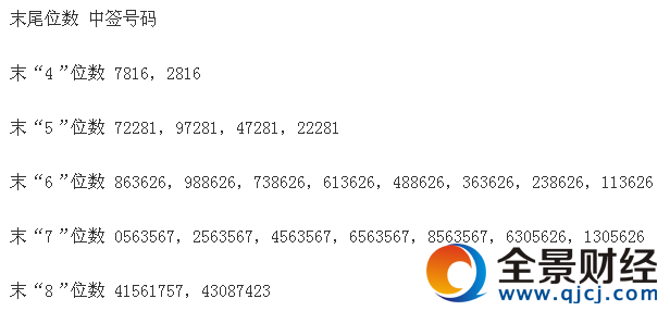 根據交易所規定,每個中簽號碼只能認購1000股海量數據(603138)股票。凡參與申購的投資者持有的申購配號尾數與上面號碼相同的,則為海量數據(603138)中簽號碼。中簽的投資者需在今日收盤前完成繳款認購。