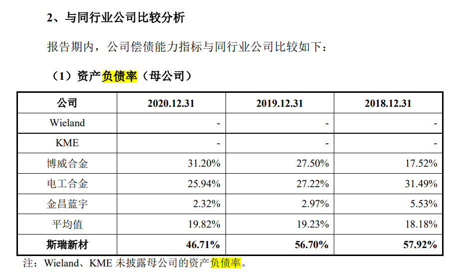 招股書顯示,招股書披露,報告期內,斯瑞新材的資產負債率(母公司)分別為58.56%、58.11%、50.45%。相比之下,其同行的明顯低不少,甚至同行公司金昌藍宇的負債率只有個位數。而同行中負債率最高的博威合金,其資產負債率也只有31%左右,比斯瑞新材低10多個百分點。