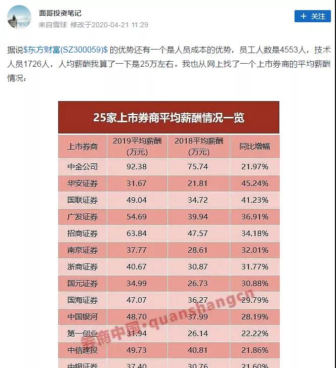 譬如券商板塊的龍頭公司中信證券,中報披露,上半年應(yīng)付員工薪酬增加了106億元,按照中報披露的員工總數(shù)11380人來算,人均薪酬近百萬元!中信證券“高人一等”的薪酬,也彰顯了其當(dāng)之無愧的券商龍頭老大地位。