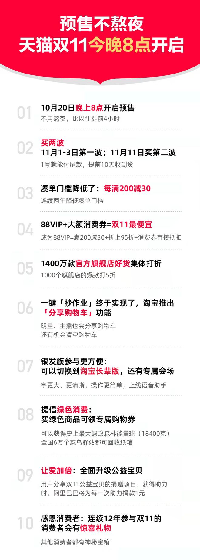2、預售不熬夜:雙11預售提前到晚上8點,“定金人”今晚(10月20日)8點就可以付定金、搶尖貨了。