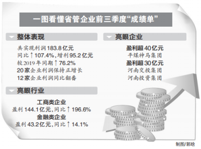 10月21日,在河南省管企業2021年前三季度經濟運行情況新聞發布會上,河南省國資委副主任劉孟連介紹,前三季度,省管企業共實現利潤183.8億元,同比增長107.4%,較2019年同期增長76.2%。其中,有20家企業利潤保持正增長,12家企業利潤同比翻番。