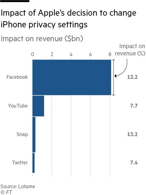 Lotame公司的估計可能比較保守。廣告技術顧問埃里克·索弗特(Eric Seufert)表示,僅Facebook一家公司今年下半年可能因為蘋果隱私政策調整而損失83億美元。他認為,隨著整個廣告領域根據用戶隱私重建模式,由此帶來的營收損失將延續到下一個季度。