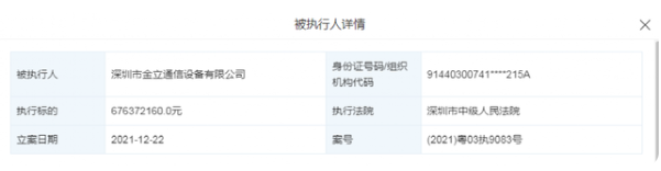 天眼查App顯示,12月22日,金立手機關聯(lián)公司深圳市金立通信設備有限公司新增一條被執(zhí)行人信息,執(zhí)行標的6.76億元,案號為(2021)粵03執(zhí)9083號,執(zhí)行法院為深圳市中級人民法院,關聯(lián)案件為金融借款合同糾紛。