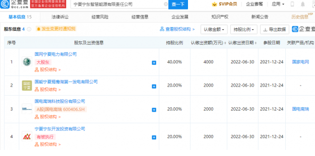 企查查股權(quán)穿透顯示,該公司由國網(wǎng)寧夏電力有限公司、國電南瑞(600406)等共同持股。