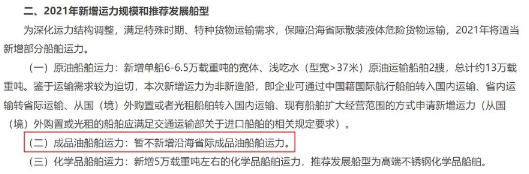 據交通運輸部2021年5月7日發布的《2020年沿海省際散裝液體危險貨物船舶運輸市場及2021年新增運力規模和推薦發展船型》(下稱“2021年新增運力公告”),2021年監管部門將“暫不新增沿海省際成品油船舶運力”。