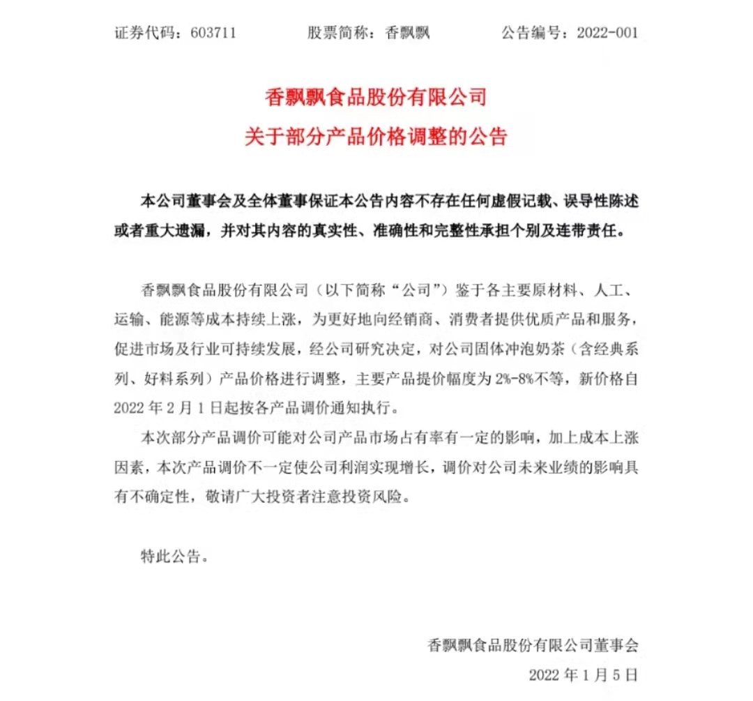 根據(jù)香飄飄發(fā)布的最新公告,鑒于各主要原材料、人工、運(yùn)輸、能源等成本持續(xù)上漲,為了更好地向經(jīng)銷商、消費(fèi)者提供優(yōu)質(zhì)產(chǎn)品和服務(wù),促進(jìn)市場(chǎng)及行業(yè)可持續(xù)發(fā)展,經(jīng)公司研究決定,對(duì)公司固體沖泡奶茶(含經(jīng)典系列、好料系列)產(chǎn)品價(jià)格進(jìn)行調(diào)整,主要產(chǎn)品提價(jià)幅度為2%-8%不等,新價(jià)格自2022年2月1日起按各產(chǎn)品調(diào)價(jià)通知執(zhí)行。