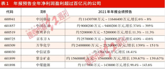 在這些發布業績預告的公司中,以預增、略增、續盈、扭虧等不同形式預喜的有589家,占全部已發布預告公司比重的85.99%。從盈利能力來看,中國移動的吸金力最強,預告顯示其全年凈利潤額有望實現1143.07億元~1164.64億元,是目前惟一盈利額預計超過千億元的公司。除此之外,中國石油、貴州茅臺、京東方A、萬華化學、中信證券、紫金礦業、中煤能源7家公司的賺錢能力也很強,全年凈利潤額均預計實現百億元以上。在這幾家公司中,中國石油、京東方A、萬華化學、紫金礦業、中煤能源的增長勢頭明顯更強,預增幅度均超過了100%。