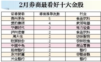 被券商推薦次數較多的金股還包括美的集團、寧德時代、瀘州老窖、周大生、牧原股份、中國中免等。券商在2月延續了對大金融板塊的看好,招商銀行、東方財富、寧波銀行、興業銀行等多只個股獲得推薦。