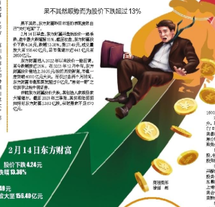 2月14日早盤,東方財富開盤后股價一路殺跌,盤中最大跌幅超15%,截至收盤,東方財富股價下跌4.24元,跌幅13.36%,報27.49元,成交量放大至156.40億元,總市值縮水近441億元至2850億元。