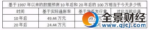 基于1997年以來的數(shù)據(jù)預(yù)測(cè):根據(jù)中國(guó)人民銀行公布的數(shù)據(jù),計(jì)算出來1997年以來中國(guó)的廣義貨幣供應(yīng)量的年增長(zhǎng)率約為16.9%,基于這一數(shù)據(jù),我們?cè)俅慰梢灶A(yù)測(cè)現(xiàn)在的100萬元,10年后和20年后分別相當(dāng)于今天的多少錢。