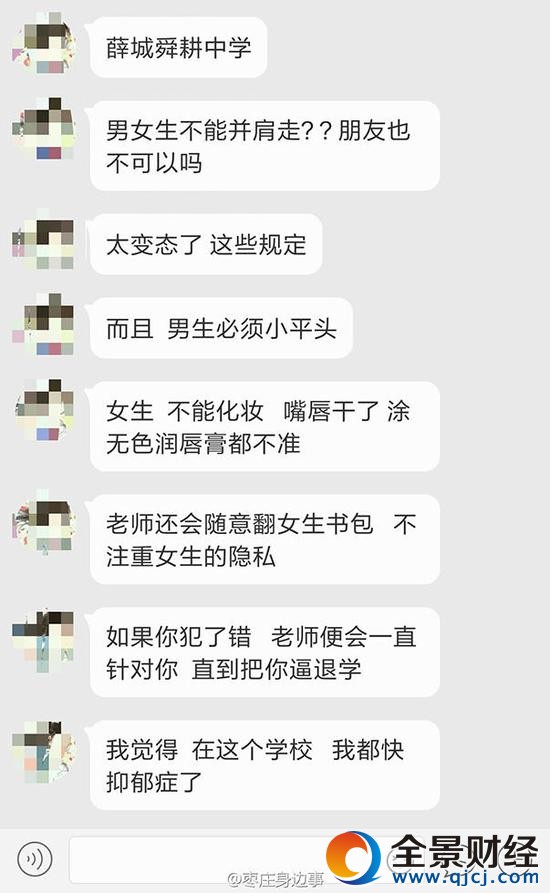 圖為學生爆料截圖。這名學生認為學校管理太嚴,“快抑郁了”。