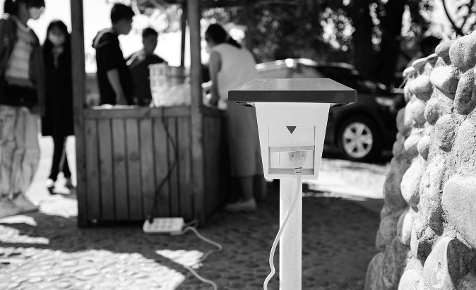 近年來,寧夏石嘴山市大武口區龍泉村大力推進鄉村旅游餐飲、住宿、交通等領域的電能替代工作,通過建設“智能龍泉”“農家樂煤改電”“空氣源熱泵”等項目,降低煤炭、柴油等傳統化石能源的使用,減少污染排放,助力鄉村綠色可持續發展。圖為在龍泉村,路邊的攤位通過共享電源樁用電