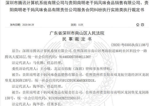 騰訊狀告貴州老干媽,請求查封1624萬元公司財產 法院已裁定