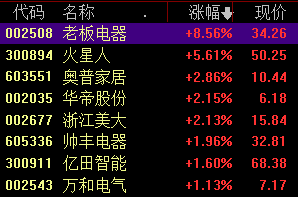 廚衛電器板塊大幅拉升 老板電器漲逾8%火星人漲逾5%