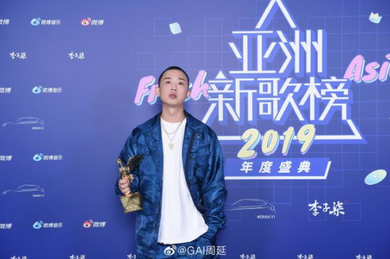 10月31日,亞洲新歌榜2019年度盛典在北京舉行,GAI獲得年度說唱歌手榮譽。稍后,GAI通過微博曬領獎的照片,并配文寫道:“很榮幸能再一次拿到年度說唱歌手大獎。感謝我的公司給我無限的支持和力量,感謝我的兄弟姐妹一路的陪伴,感謝我永遠的第一個聽眾,感謝新浪娛樂、亞洲新歌榜見證我的這一年。說唱從來不是負能量!我們需要把正能量帶給年輕聽眾!感謝說唱,感謝音樂!我們演唱會見!”