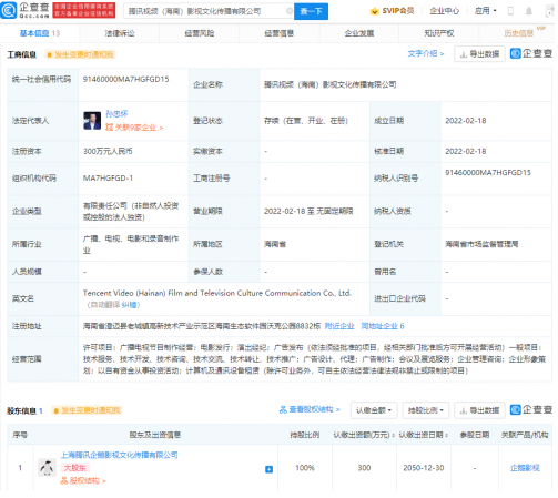 企查查APP顯示,2月18日,騰訊視頻(海南)影視文化傳播有限公司成立,法定代表人為孫忠懷,注冊資本300萬元人民幣,經(jīng)營范圍包含:廣播電視節(jié)目制作經(jīng)營;電影發(fā)行;演出經(jīng)紀;廣告發(fā)布等。企查查股權(quán)穿透顯示,該公司由上海騰訊企鵝影視文化傳播有限公司100%控股。