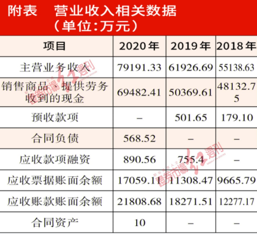 2019年情況類似,當(dāng)年公司的主營業(yè)務(wù)收入為61926.69萬元。合并現(xiàn)金流量表中當(dāng)年“銷售商品、提供勞務(wù)收到的現(xiàn)金”為50369.61萬元。同期預(yù)收款項和合同負(fù)債為501.65萬元,較2018年對應(yīng)項目新增322.55萬元,剔除該影響后,與2019年營收相關(guān)的現(xiàn)金流入了50047.06萬元。在不考慮增值稅影響的情況下,將其與同期主營業(yè)務(wù)收入勾稽,則2019年應(yīng)至少有11879.63萬元的營收未收到現(xiàn)金,理論上,該部分差額同樣應(yīng)體現(xiàn)為當(dāng)期經(jīng)營性債權(quán)的增加。