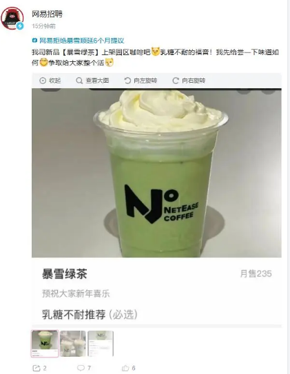 據網友爆料,網易園區咖啡廳推出兩款新品:暴雪綠茶、暴雪沒有心。