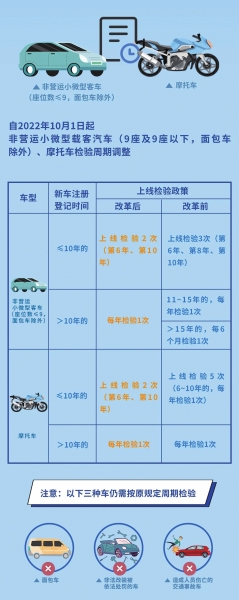 除了非營運小微型載客汽車,摩托車也由原10年內(nèi)上線檢驗5次調(diào)整為檢驗2次(第6年、第10年),10年以后每年檢驗1次。