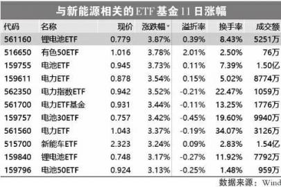 受此影響,10月11日,創(chuàng)業(yè)板指高開后震蕩,盤中一度漲超1.6%,與鋰電等動力電池相關(guān)的板塊表現(xiàn)強勁。場內(nèi)基金中,鋰電、電池、新能源汽車、碳中和等相關(guān)指數(shù)的ETF上漲明顯。數(shù)據(jù)顯示,14只ETF漲幅超過3%,包括富國中證電池主題ETF、華夏中證細分有色金屬產(chǎn)業(yè)ETF、廣發(fā)國證新能源車電池ETF、廣發(fā)中證全指電力公用事業(yè)ETF、銀華中證全指電力公用事業(yè)ETF等,漲幅為3.87%、3.78%、3.73%、3.54%、3.52%。