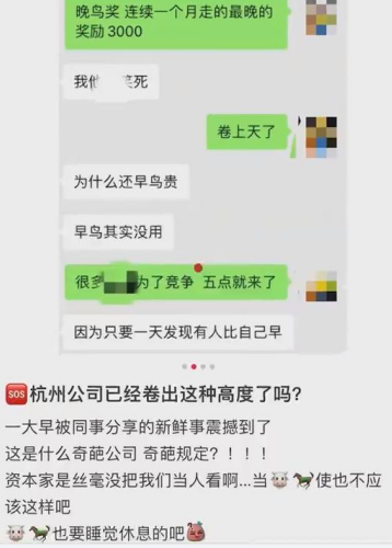 有網(wǎng)友曝料稱,浙江杭州的一家公司設(shè)立了 " 早鳥獎(jiǎng) " 和 " 晚鳥獎(jiǎng) " 獎(jiǎng)勵(lì)制度,激勵(lì)員工早到晚退。