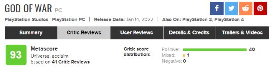 《戰神》PC版媒體評分正式解禁,截止發稿前該作在Metacritic的媒體均分為93分,在M站收錄的41家媒體評分中,40家媒體給出好評,1家媒體給出了中評。