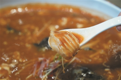 輕舀魚羹,里面整塊整塊的魚臉肉清晰可見(jiàn)。入口,酸辣味道在前,魚皮爽滑有彈性、魚肉鮮美,相比于魚肉被劃散的宋嫂魚羹,宋嫂拆燴魚頭更多了一份入口的滿足感。